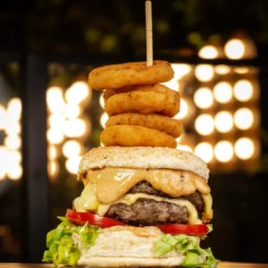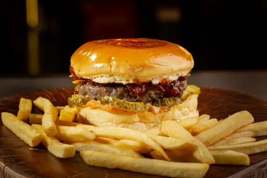 Pão de brioche, hambúrguer de contra filé, queijo cheddar, picles e cebola caramelizada.
